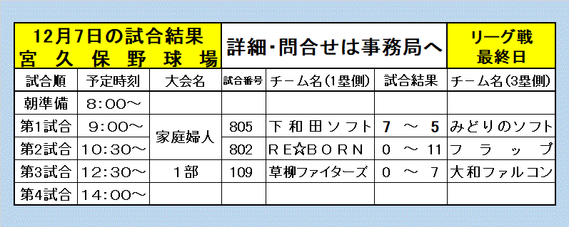 家庭婦人リーグ戦結果、刷新しました。(12月8日)